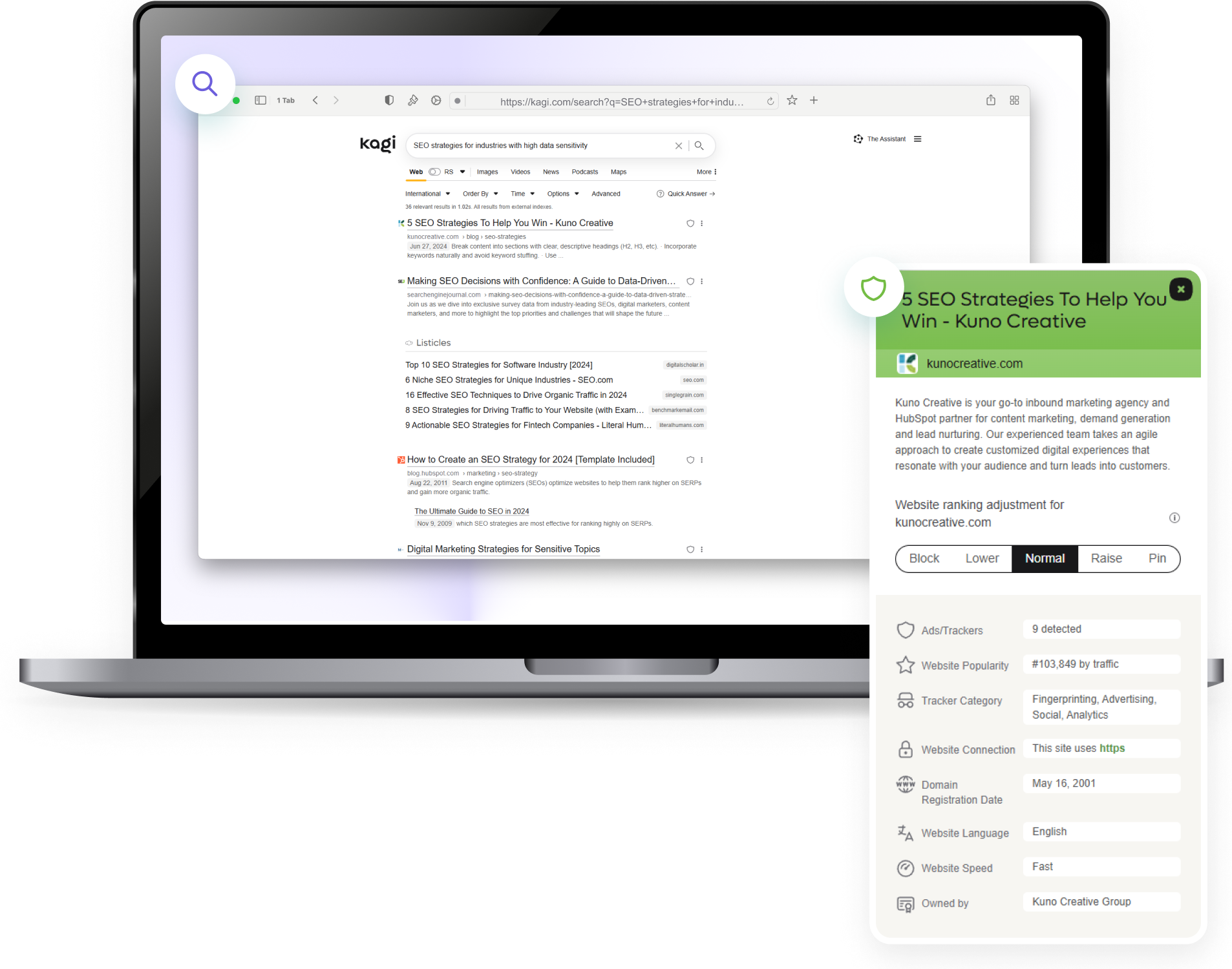 Unlike ad-supported, data-hungry, search engines Kagi is funded solely by subscriptions. This means no ads, no tracking, and results ranked purely on quality—not advertiser payments or engagement metrics.